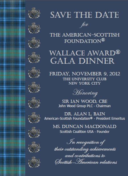 The Directors of the American-Scottish Foundation® invite you to attend the ASF Wallace Award® Gala Dinner on Friday, November 9, 2012, at the University Club in New York City. The event will honor: